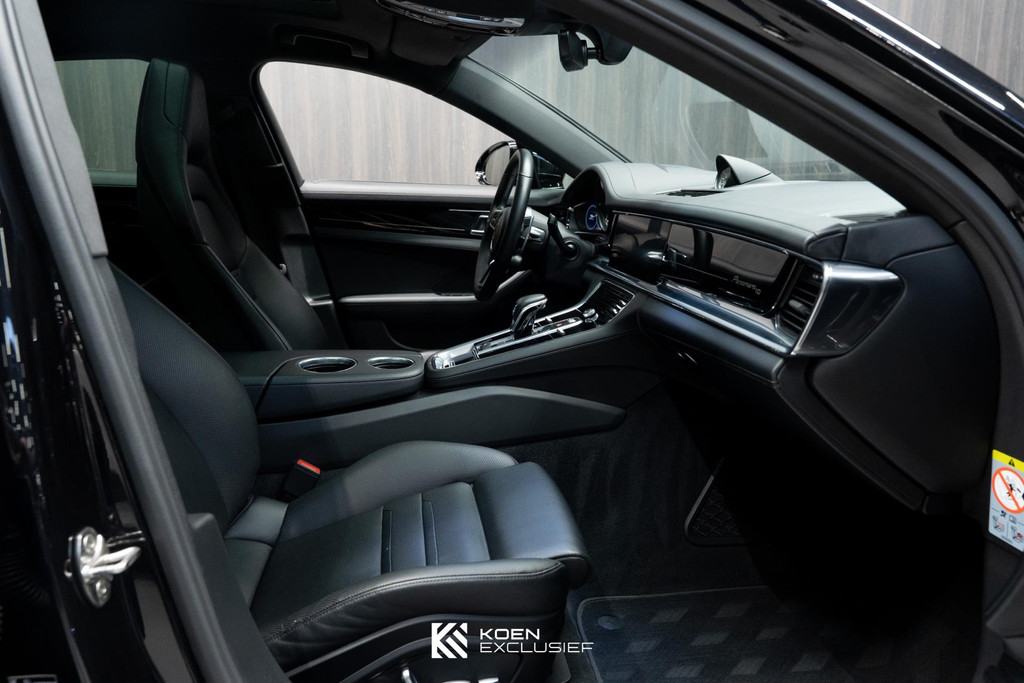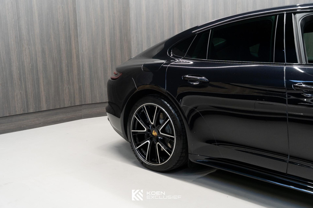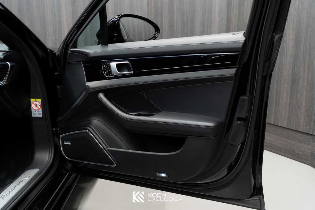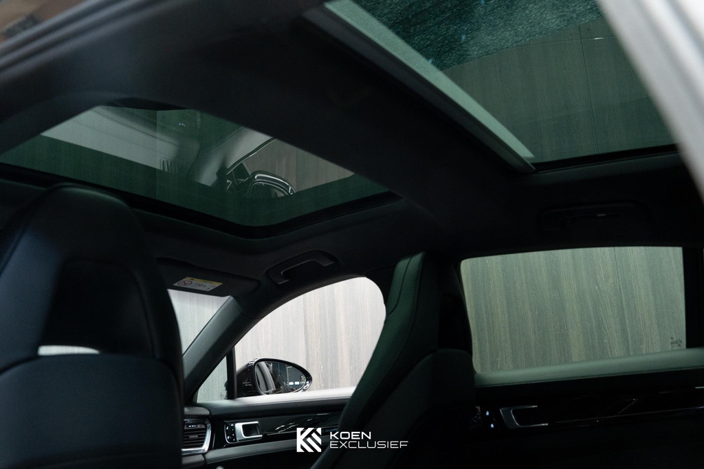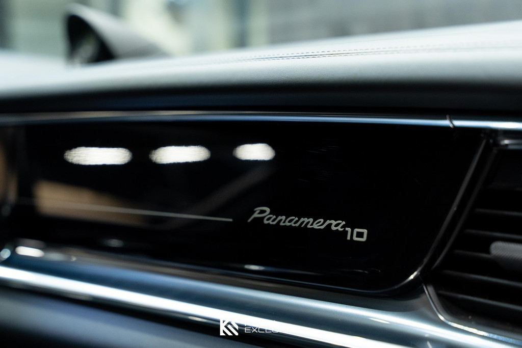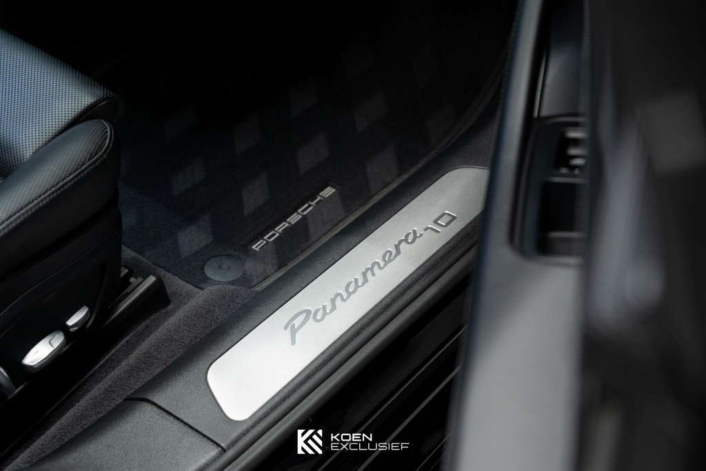 Sportuitlaatsysteem zwart, stuurwielverwarming, 21 inch Exclusive Design wiel diepzwart metallic gespoten, stoelventilatie voorstoelen, afdekking bekerhouders voorin, verval van Panamera 10 aanduiding op voorportieren, parkAssistent voor en achter incl. camera en Surround View, Matrix LED koplampen inclusief Porsche Dynamic Light System Plus (PDLS Plus), 4-zone automatische airconditioning, ‘PORSCHE’ logo zwart hoogglans, Head-Up Display, adaptieve cruise control inclusief filehulp, opbergvakkenpakket, sierlijsten rond zijruiten zwart hoogglans, sfeerverlichting, SportDesign sideskirts, adaptieve luchtvering inclusief PASM, remzadels zwart, stuurbekrachtiging Plus, naafdoppen met wapen in kleur, panoramadaksysteem, stoelverwarming voor, privacybeglazing zij- en achterruit, zelfdimmende binnen- en buitenspiegels, dashboard en portieren in leder, interieurpakket hoogglans zwart, Porsche embleem op hoofdsteunen, SportDesign buitenspiegiels zwart hoogglans gespoten, automatische dimmende buitenspiegels, dorpellijsten geborsteld aluminium, rijstrookwisselhulp, adaptieve cruise control, BOSE Surround Sound-System, Apple CarPlay, Smartphone compartiment, on-board lader met 7,2 kW, sportstoelen elektrisch verstelbaar,