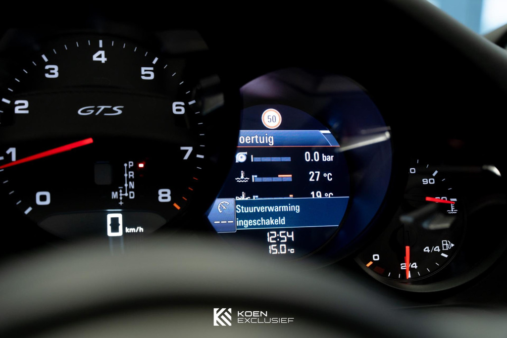90 liter benzine tank, Porsche Doppelkupplung (PDK), stoelverwarming, cruise control, rijstrookwisselhulp, achterasbesturing, GT sportstuur met stuurwielverwarming, voorruit met grijze band, bagage net bij voetruimte passagier, indicatie maximale snelheid, parkAssistent voor en achter inclusief camera, stuurbekrachtiging Plus, BOSE, adaptieve sportstoelen Plus (18-voudig verstelbaar, elektrisch) met Memory Pakket, zelfdimmende binnen-/buitenspiegels met geïntegreerde regensensor, lamellen motordeksel gespoten, LED koplampen ZWART inclusief Porsche Dynamic Light System Plus (PDLS+), zonnekleppen leder, bekleding, Porsche embleem op hoofdsteunen en afdekking koplampsproeiers gespoten.