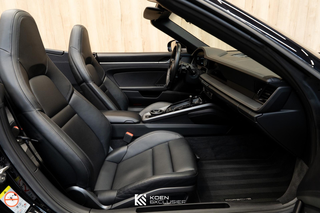 Mooi complete en tijdloze Porsche 992 Carrera S Cabriolet in zwart / zwart / zwart. Zwarte lak, zwarte cabriokap en zwart leder interieur.
