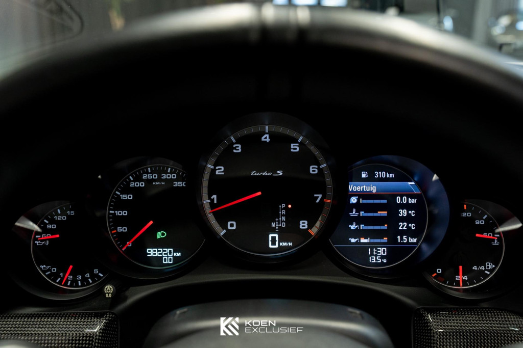 De standaard uitrusting van de Turbo S omvat onder andere een hoger motorvermogen van 560pk. Ook de gerobotiseerde versnellingsbak PDK is standaard, net als de koolstofceramische remmen (pccb) en speciale velgen met centrale wielmoer. Verder kun je rekenen op een sperdifferentieel tussen de achterwielen, het Sport Chrono Pack en pdcc (Porsche Dynamic Chassis Control).